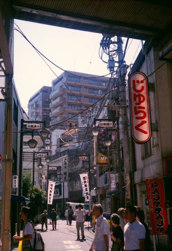 Alright! My favourite pictures from 2002 were all from Asakusa, which is famous for the Sensō-ji (sensoji, if you can't read that properly), a Buddist temple in an area with smaller temples, a beautiful five-story pagoda, and the Nakamise shopping arcade selling assorted tat. I really liked Asakusa in general though, it seemed more of a working class district to me...Anyhoo, we'll start in and around the streets of Asakusa before heading toward the temple, okay?
