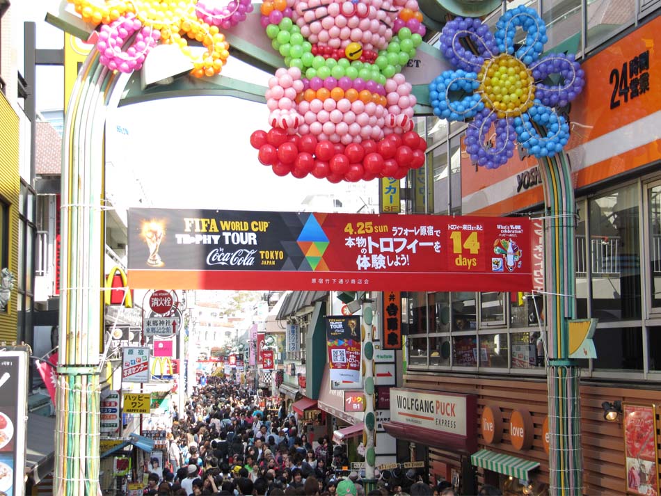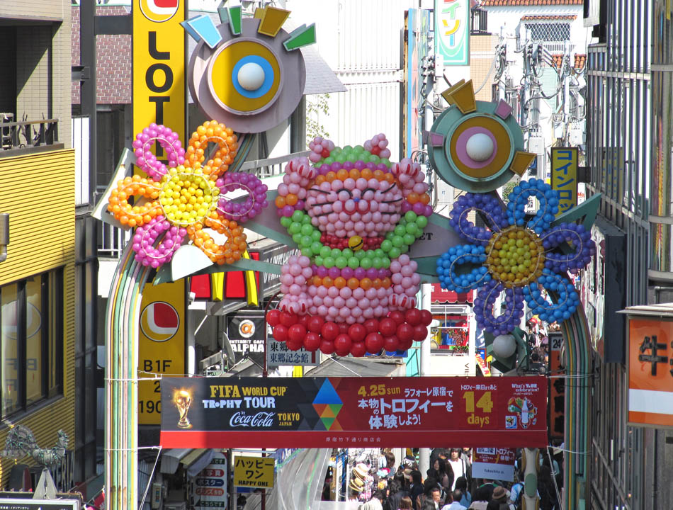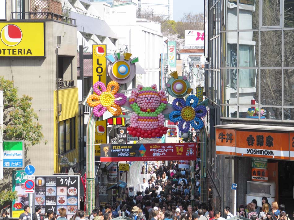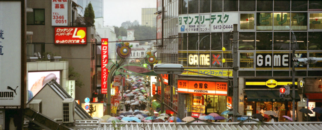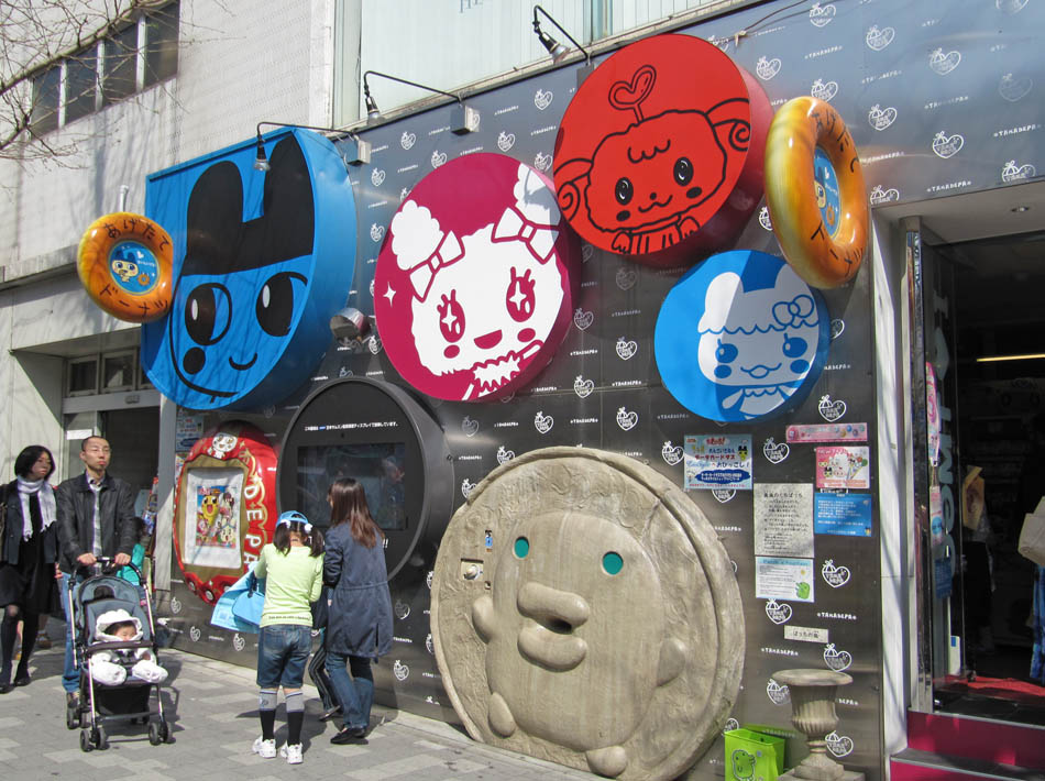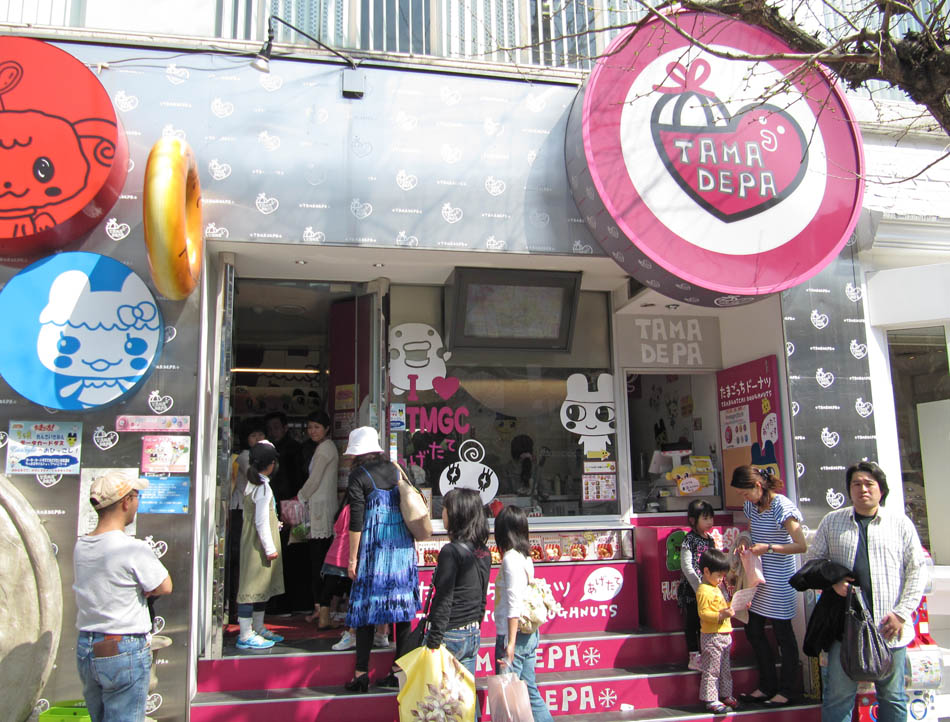 Harajuku is a busy, busy, busy place! It also rains alot when I'm there, and the panoramic picture shows the sea of umbrellas. Also, some pics are of the shop Tama Depa, which is a Tamagotchi superstore. Ahh yes, remember those things? They gained popularity in the West during the mid-nineties. That storm has long since blown away, but the l'il critters in Japan still love 'em. The shop also sells doughnuts and other sweets, stickers, and anything other paraphernalia connected to those tiny machines that ACTUALLY LIVE and BREATH. Or something. I remember a former colleagueback in Manchesteraround that time (the mid-nineties), who had just purchased one. It absolutely infuriated her, and when I enquired what the problem was, she replied "the little bastard's died four times this morning alone!"
