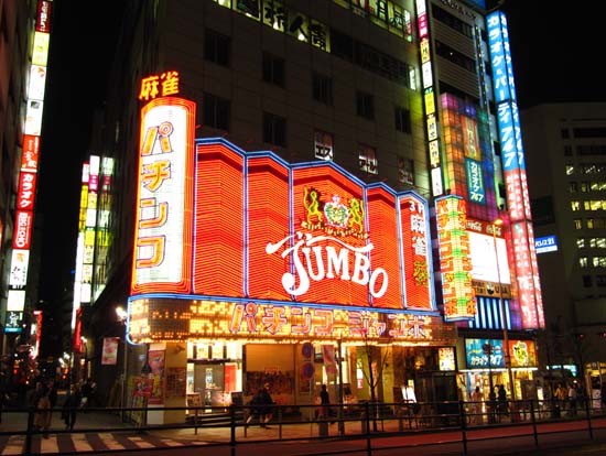 Pachinko parlours are indeed a Japanese phenomenon. Gambling is very big business in Japan. From cycling to horse-racing, gambling is an extremely popular past-time, but Pachinko is bigger, brasher and has more balls. Pinballs, folks. That is what it consists of. Ball bearings and holes and flashing garish colour and incessant noise. Trillions of Yen is spent gambling away in various pachinko joints all over Japan. Alot more have appeared since I was last in Japan. Hmm. They always seem to be jam-packed with people, often with others walking around trying to find a space. Must... gamble... got to.... need...
