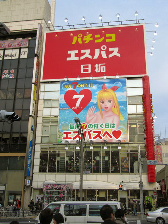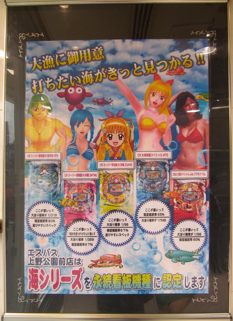 ABOVE: This blonde bikini-clad (what else?) character seemed to be everywhere on the streets of Tokyo. She appeared ABOVE RIGHT as well, on a poster showing the 5 different types of pachinko machines you can choose to play. At this Parlour in Ueno, each floor had a different game, meaning five floors of madness! BELOW: The Lurid colours of a modern Pachinko parlour. And it's balls aplenty BELOW RIGHT. As the sign says "GREAT!"