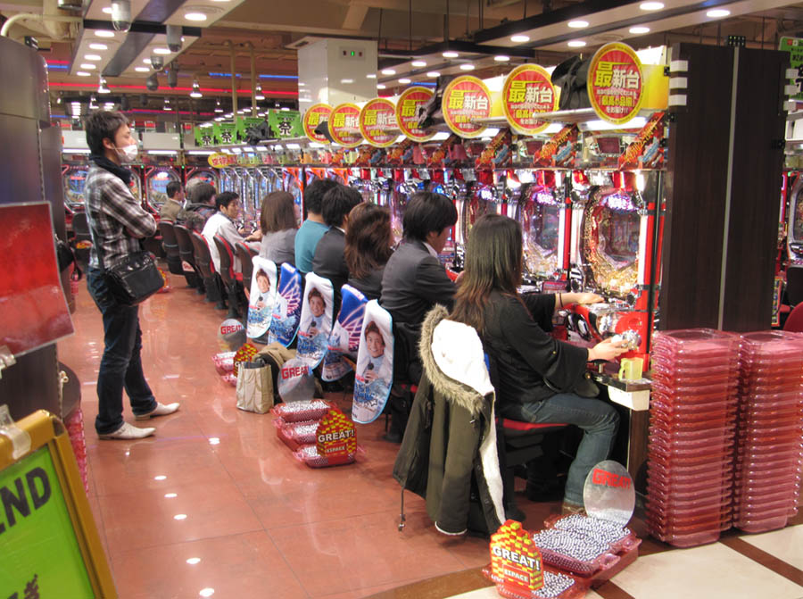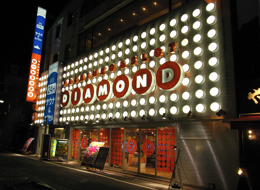 ABOVE: Glossy exteriors of two pachinko parlours in Tokyo. Diamond is in the seedy backstreets of Ueno, and Jumbo is in Shinjuku.