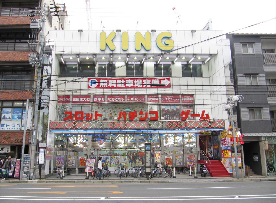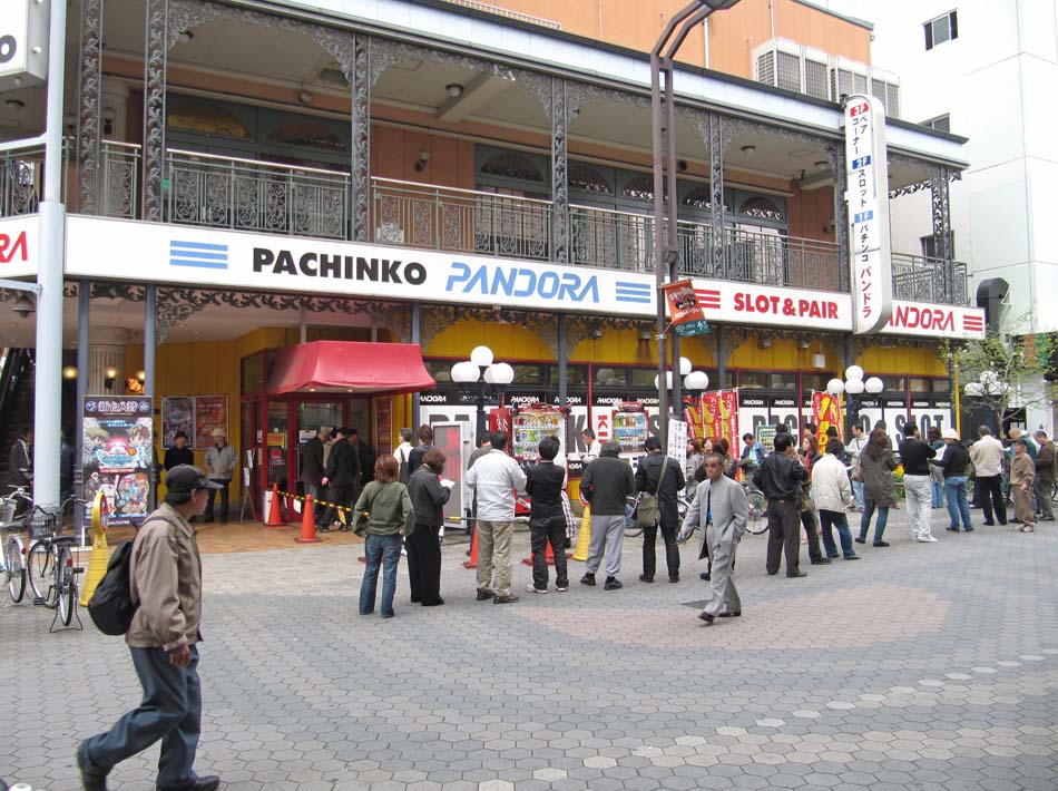 This pachinko page needs a garish colour to reflect the garish parlours scattered aroound Japan. By day the queues begin early (below right in Asakusa on an early Sunday morning!), and whilst some pachinko parlours are more hidden away, others are bright, bold, loud and ugly. The King parlour in Kyoto looks rather drab on the outside, as does Pandora, but most of the newly-built parlours are bigger and glossier than the older ones. Pachinko is where you purchase balls and slot them in the machine, then you have to guide the balls into certain holes, some of which give out more balls than others. The more balls you get, the greater prize you can claim when you finish. Balls cannot be exchanged for cash, but (cough) I'll bet you places actually do just that.