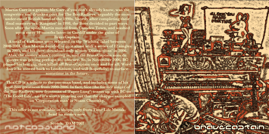 18 months later, Mr Carr washed up in Cardiff, under the guise of 'BraveCaptain'. A total of 4 albums were released on the 'Wichita' label between 2000-2004, then Martin decided to go it alone with a series of 12 singles, and his (free) download-only album 'Distractions' in 2006... all via his website. Alas, the money wasn't coming in, and in November 2006 BraveCaptain played his final gig, then killed-off his nom de guerre once and for all.