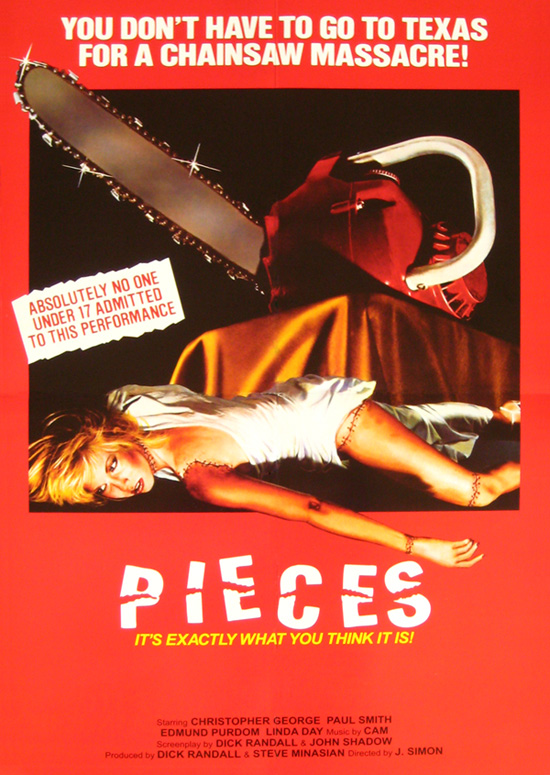 1980s Spanish Sleaze-fest Pieces has all the right ingredients for a chainsaw exploitation pic; lots of nudity, lots of rather unnecessary, OTT splatter-gore, poor dubbing and crud 80's music by CAM (in the American version, that is). And it's all over in 85 minutes, lovely stuff!