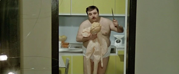 In fact, the delicious Edwige Fenech is barely clothed throughout the entire movie. Wonderful! Add to this the crazy, comical English dubbing, and a fat man in a nappy with a blow-up doll (below), plus groovy tunes from Berto Pisano, and we have a winner!