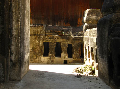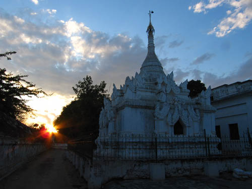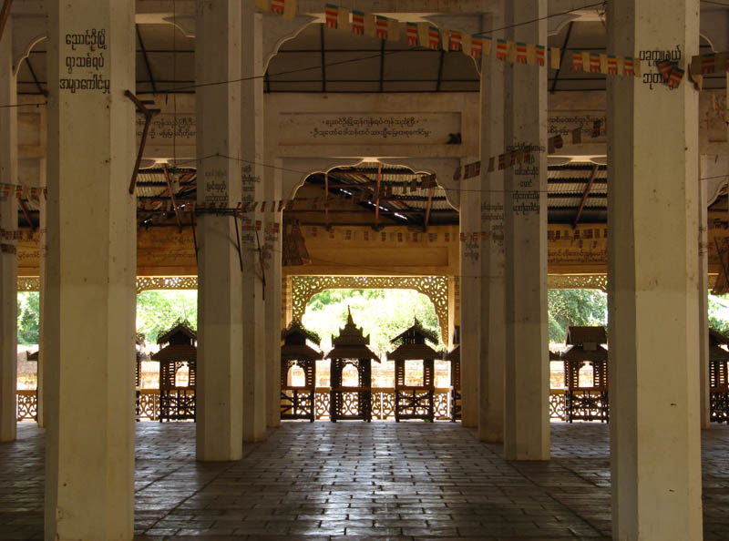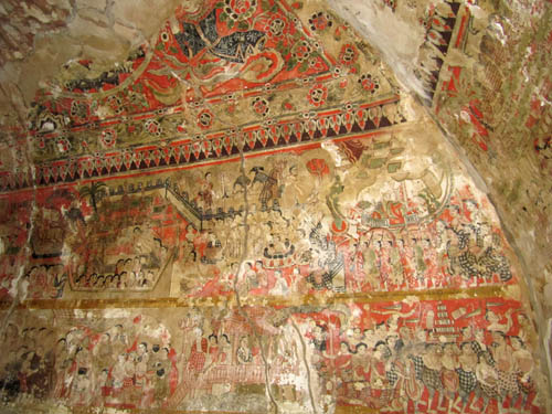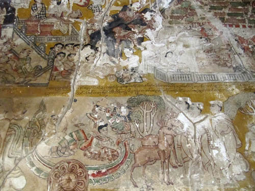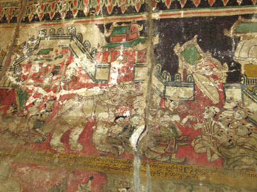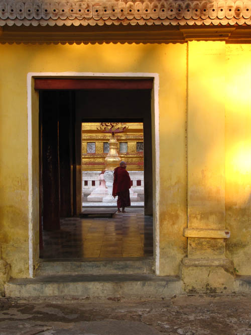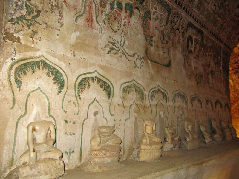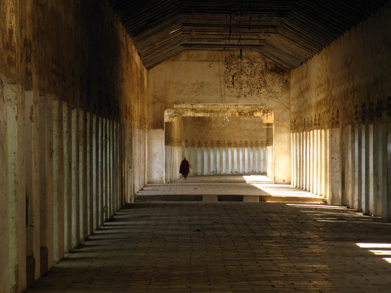 ABOVE LEFT: The Monk walking down the tunnel is one of my favourite pictures. ABOVE RIGHT: The sun sets nearby the Shwe-zi-gon pagoda. BELOW: A small pagoda with deteriorating artwork all over the walls. I have no information on the age of these frescos, but it's a fascinating interior!