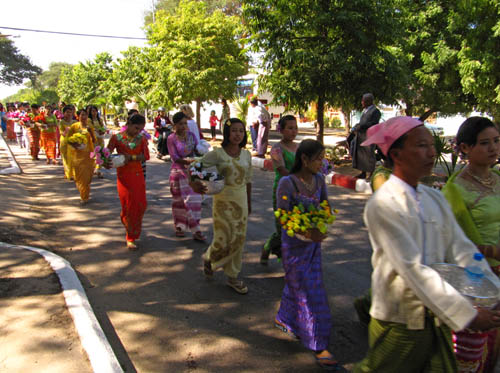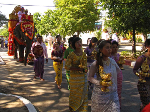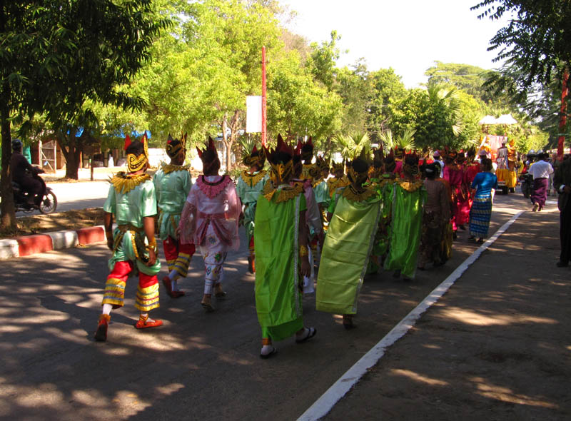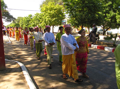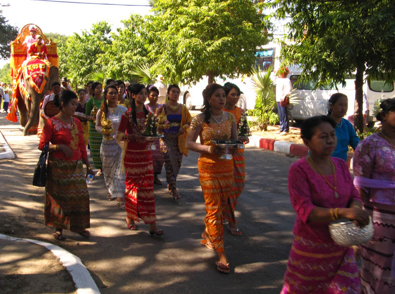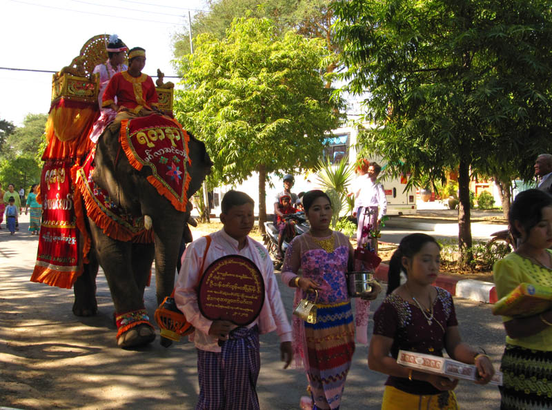 Whilst staying in Nyaung-U, I stumbled across some kind of street celebration. There was a (LOUD!) P. A blaring, and many people were walking on the street dressed in traditional Myanmar clothing. It was a very beautiful site to behold, and after asking lots and LOTS of questions, I found out that it was a celebration of a boy becoming a monk. I'd call it an ordination ceremony, but I'm not sure if that translates into Burmese. Anyhow, the boy on the elephant is the one in question, and the parade of people are heading to the cemetery to donate various gifts to Buddha. Smashing.