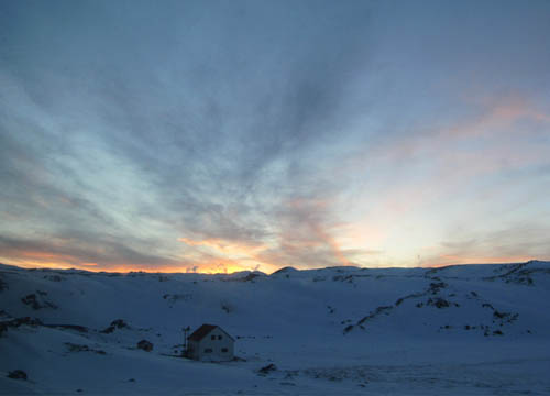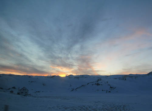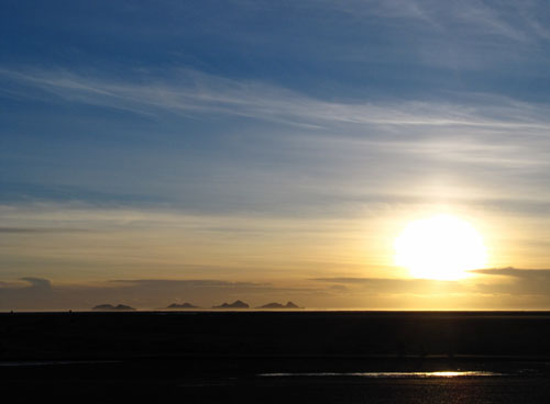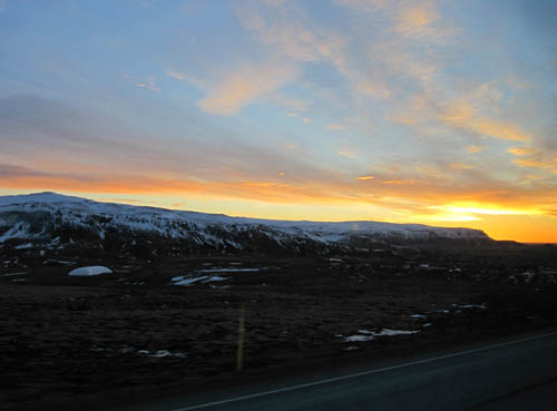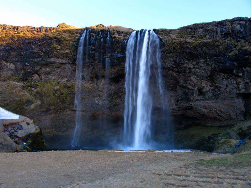 ABOVE LEFT: Just to the right of the sunrise, you should see a group of islands. You can see them more clearly ABOVE RIGHT, the picture showing a sunset. These islands are called Vestmannaeyjabær (Westman Islands), and are approacahble by ferry. You can see the Puffins here in the Summer. BELOW: Some pictures of the very famous waterfalls Skógafoss (The BIG one) & Seljalandfoss (the slightly smaller one). I'd liked to have spent more time here, but the sun was setting and time was running out!
